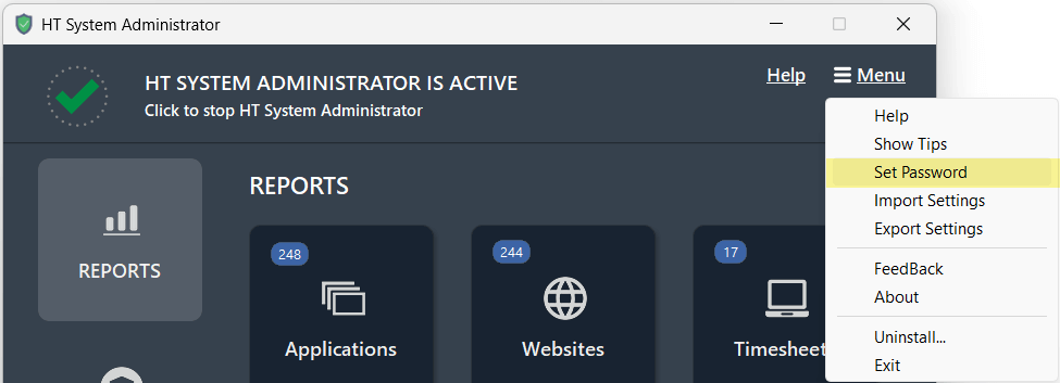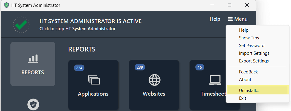 The software uninstallation is protected from unauthorized users. HT System Administrator cannot be uninstalled from Windows Control Panel or by removing its folder or executable file. To uninstall it, you need to log in to HT Work Focus.